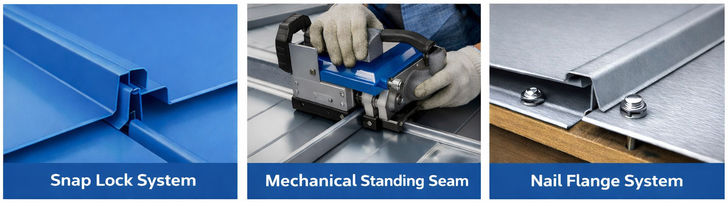 In practice, metal roofing panels are joined using concealed fastening technologies designed to protect screws and seams from water, wind uplift, and thermal movement. The most widely used systems include Snap Lock, Mechanical Standing Seam, and Nail Flange profiles.